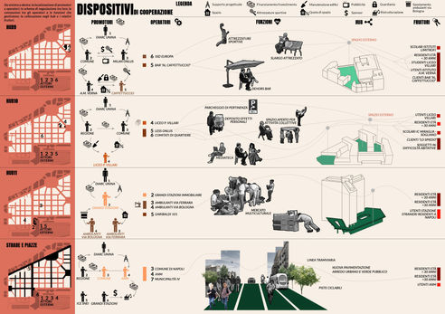 Vasto is a Neapolitan district located close to the Ancient Center and the Central Station. It arose in the nineteenth century on a marshy area, known as Guasto, word that means rotten, malfunctioning, ruined, like many areas of the contemporary territory, in which the city relegates troublesome functions and marginalized communities. For this reason, in these areas, there is a progressive development of slow violence: a form of violence that is not impetuous, but gradual and incessant. These processes remain under track for a long time, until some sudden event triggers the conflict. This is what has happened to Vasto, which has first hosted earthquake victims and then, recently, masses of migrants, whose presence has escalated into a phenomenon of disputed public space, caused by the different habits of the communities here confined. This interpretative reading of the physical conditions and dynamics concerning the territory is the basis of a cooperation strategy aimed at activating a series of HUBs. These places of connection hold the different ideas of public space, specific to each community and, above all, they facilitate the activation of processes that involve different actors. Through a win/win logic, everyone is able to improve his life condition.